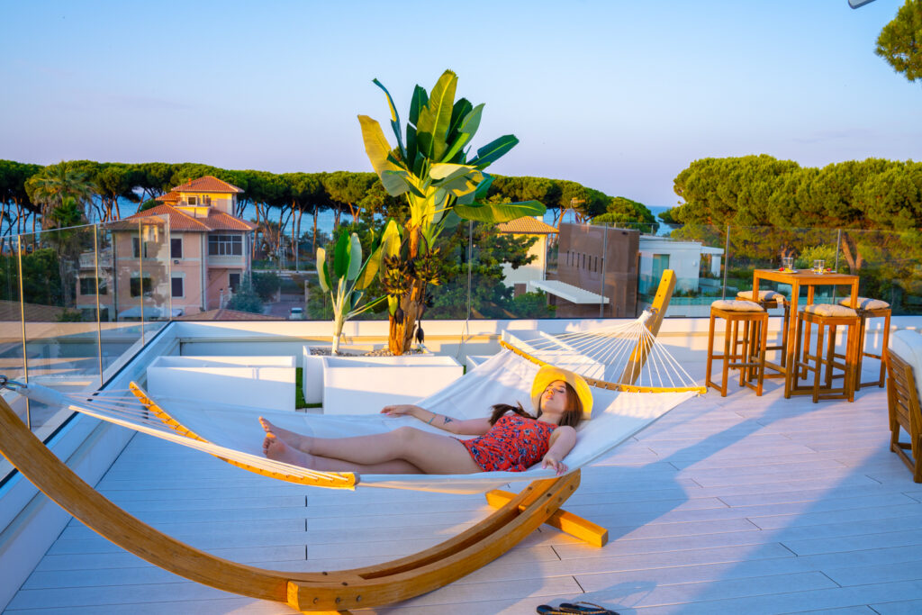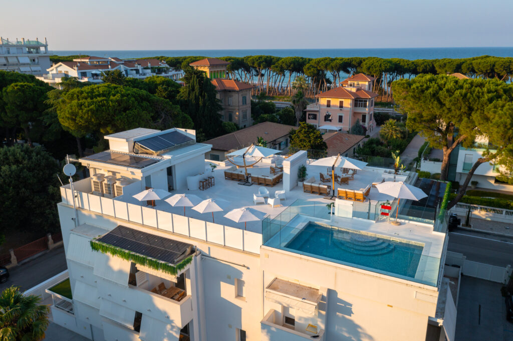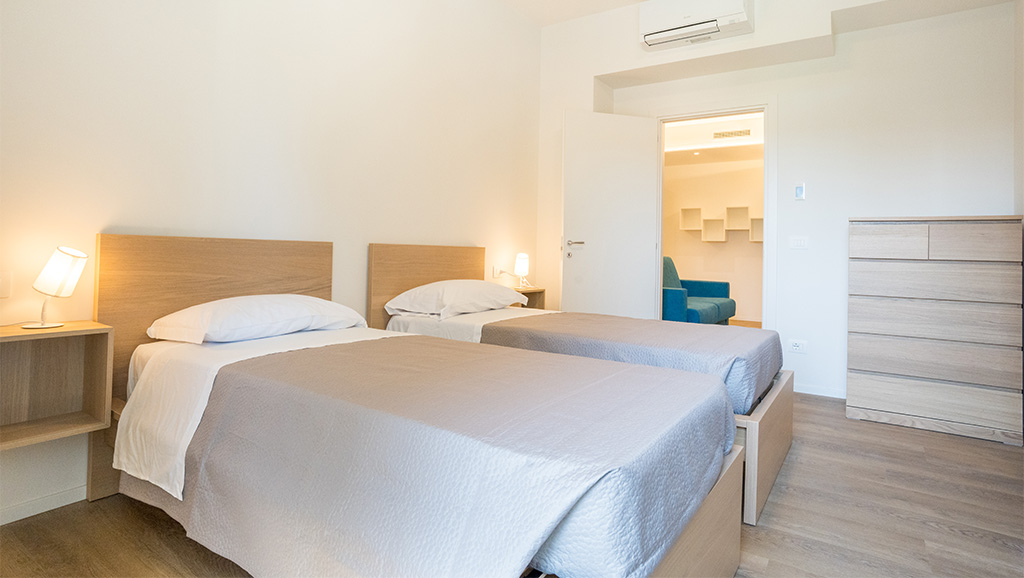 Für einen komfortablen Aufenthalt können Sie eine der 6 geräumigen ZWEI-SCHLAFZIMMER-WOHNUNGEN wählen 6 die in einem einfachen und eleganten Stil eingerichtet sind, .. Alle Wohnungen, sind vollständig , schallisoliert und verfügen über zwei Badezimmer, eine möblierte Terrasse, Klimaanlage, und eine Kochnische. Sie sind etwa 80 Quadratmeter groß und einige von ihnen bieten einen herrlichen Blick auf das Meer und den Pinienwald.